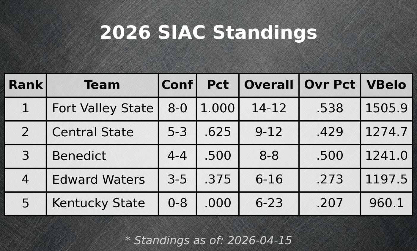 Unsurprisingly, Fort Valley State is the heavy favorite to return to the big stage. 2 out of 3 simulations of the tournament ended with the Wildcats dancing. Just looking at the VBelo rating for the teams, there is a clear front runner. They are undefeated in conference play for a reason.