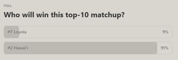#2 Hawai’i (74%) def. #7 Loyola Chicago (26%)