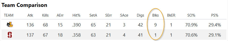 This was such an even matchup! The biggest difference: blocks. (It should be noted that Loyola did this much damage without their senior setter, Ryan McElligott.)
