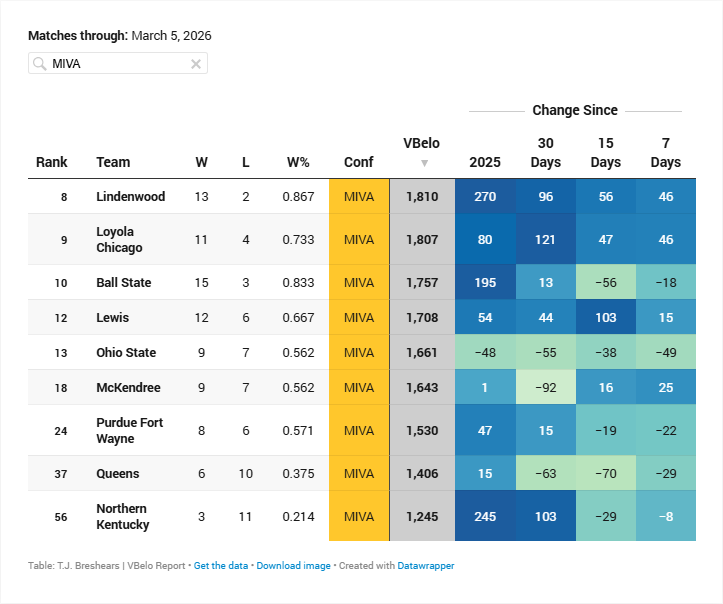 833 - The date was December 15, 2025. MIVA released their preseason poll for the upcoming season. Four teams had at least 1 first place vote. But back in 6th place was Lindenwood. Zero first place votes. Zero players on the Preseason All-MIVA Team. And yet. AND YET! The Lindenwood Lions are currently tied with Loyola atop the MIVA at 5-1 (.833). Given the current tiebreaker, Lindenwood is in first place. This team might be the most improved/most exceeding-expectations in the country.
