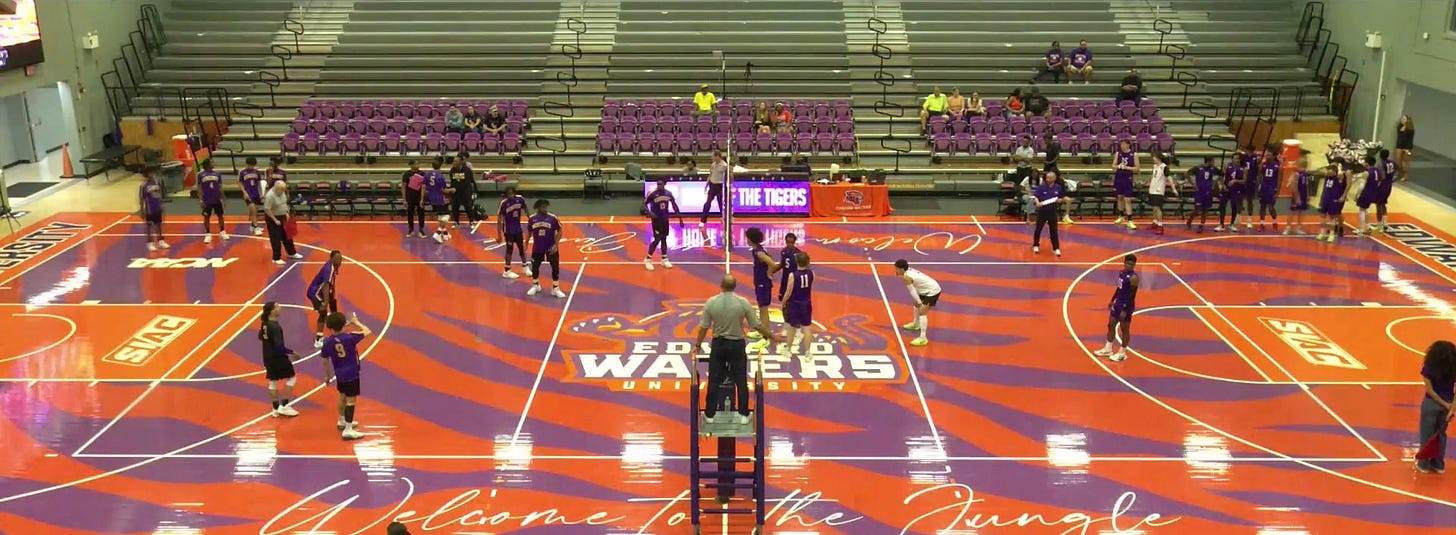 7A2682 - Okay, this one is definitely cheating because there is a number in there. But humor me. Edward Waters has some of the most distinct colors in men’s volleyball with a bright purple and orange. From my research, the purple is #7A2682 (Vanity) and the orange is #FF671D (Heat). I doubt they use the names Vanity and Heat, but how cool does that sound? You probably don’t care about any of this. But what you should care about is how these colors are used inside the Adams-Jenkins Community Sports & Music Complex. This is the most chaotic court that I have seen in volleyball. I love it. It makes the Boise State Smurf Turf looks tame. I’m sure some hate it, but I think it gives the Tigers a unique advantage that others should consider. Please, never change (unless you make it louder).