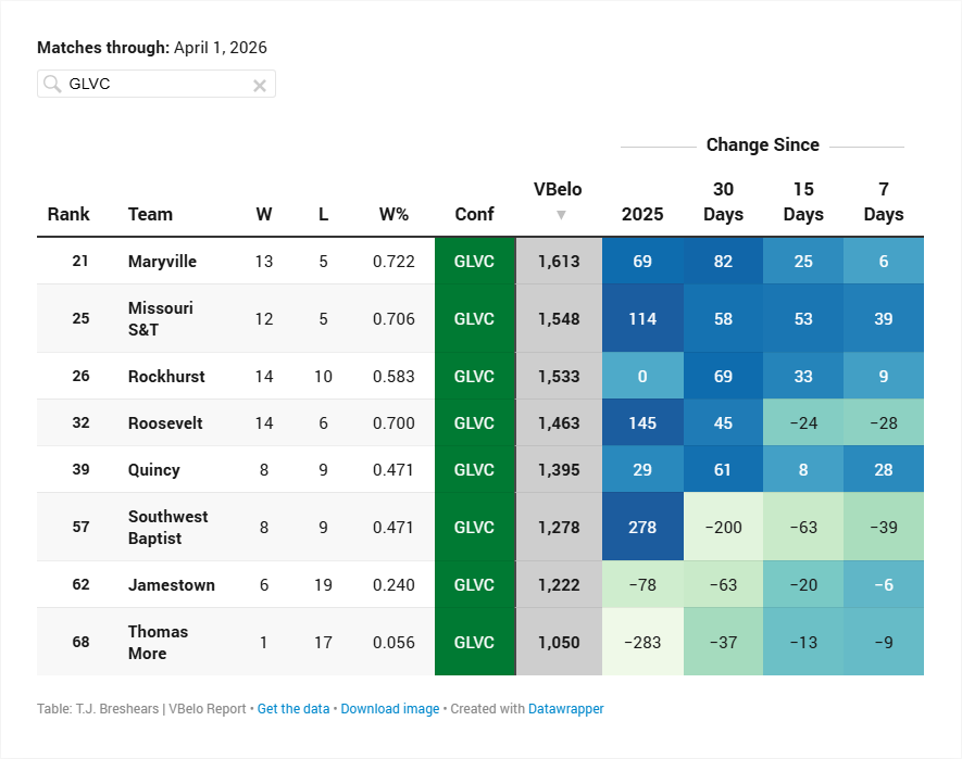 We’re Going Up, Up, Up - The top seven teams all gained elo in the past 7 days. The model actually moves slower at the end of the season, so expect one-sided wins to count even less than earlier in the year. For those closer matches, like #1 UCLA and #3 (VBelo) Pepperdine going at it this week, there is still the opportunity to make a splash in the rankings.
