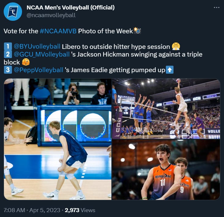 In other tournament news, Loyola can lock up the top spot in the MIVA with a win today. The Ramblers have positioned themselves incredibly well for a good postseason run. After today, all 8 MIVA teams will have just one match left. It will be interesting to see what drama the MIVA will be able to cook up for us. It has been a fantastic conference this season and my only complaint is that the season is coming to an end.