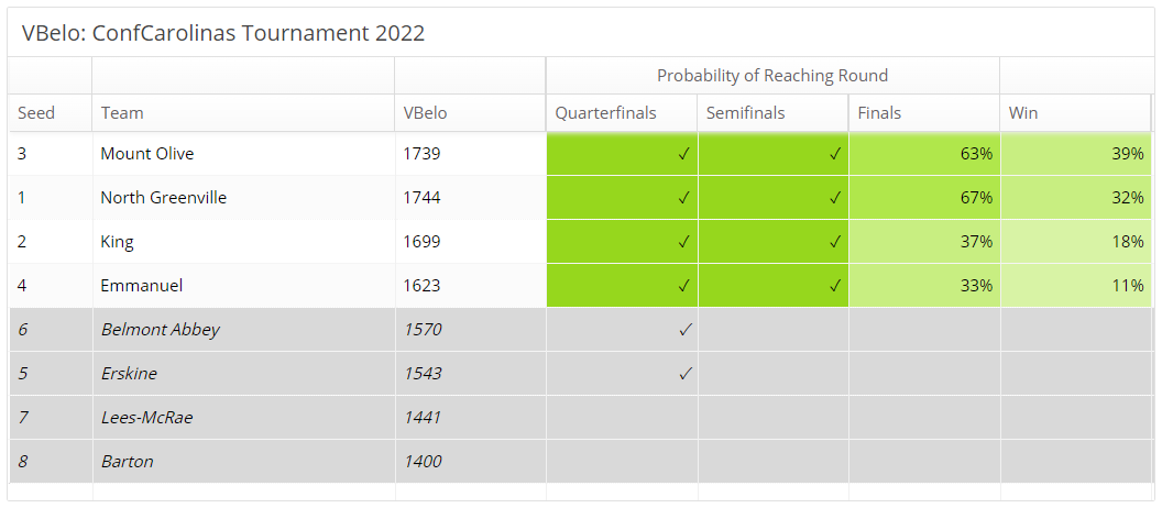 Mount Olive jumped up from 28% to 39% with its win earlier this week. Obviously they will benefit from playing on their home court, but North Greenville is rested and ready for action.