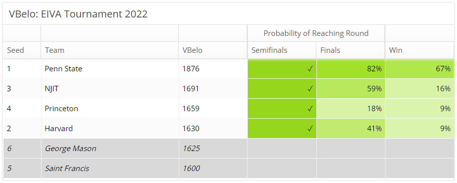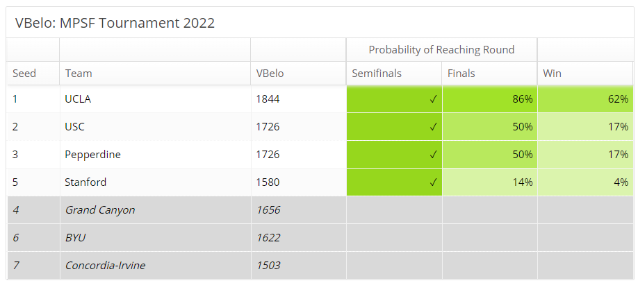 The toss-up match between USC and Pepperdine will have little affect on UCLA’s odds in VBelo since they are so closely matched. UCLA, playing at home, is a good bet to win it all, but there is still room for an upset along the way.
