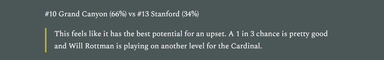 The only other upset that happened yesterday was Stanford taking down Grand Canyon in 4. I wouldn’t say I called it but this was in the Scouting Report said yesterday…